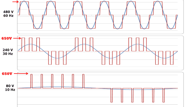 No entanto, se quisermos reduzir a frequência do motor para 30 Hz, podemos mudar o comando de chaveamento dos interruptores (que vamos chamar a partir de agora de transistores de saída) do inversor para que eles operem mais lentamente. Na teoria, se reduzimos a frequência para 30Hz, então devemos também reduzir a tensão para 240V a fim de manter a relação V/Hz.